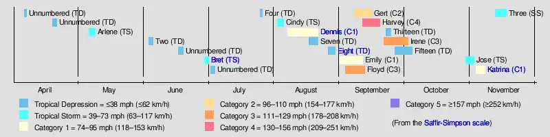 | Gert | September 7 – September 15 | Category 2 hurricane | 105 mph (169 km/h) | 988 hPa (29.18 inHg) | Leeward Islands, Puerto Rico, Bahamas, Bermuda | None | None | |