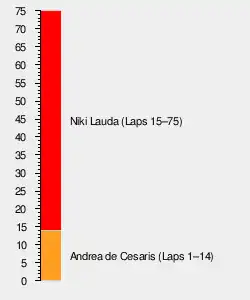 Lauda now began to cut into de Cesaris' lead, setting the race's fastest lap in the process. On lap 15, de Cesaris was held up by Raul Boesel's March in the chicane entering Shoreline Drive as he came up to lap him. This gave Lauda the momentum he needed to sweep by into the lead at the end of the straight, and the Austrian immediately began to pull away.