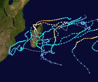During the season, the Réunion Meteorological Service tracked storms in the basin, using the Dvorak technique to estimate tropical cyclone intensities via satellite imagery.[1] The agency later became Météo-France's meteorological office at Réunion (MFR). At the time, the basin extended from the east coast of Africa to 80° E.[2] Eleven storms were named by the Mauritius Meteorological Service and the Madagascar Meteorological Service.[1] The rest of the naming list was Lalao, Monja, Nora, Olidera, Pelazy, Rija, Saholy, Tsira, Vaosolo, Wilfredy, Yannika, and Zozo.[3] The 11 named storms were slightly above the normal of 9, most of which formed in January and February. There were four intense tropical cyclones, which is twice the average. The increased activity of the season was in part due to enhanced easterlies, a strong monsoon trough, and warm water temperatures around 28 °C (82 °F) which extended to 25° S.[4]