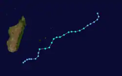 MFR began tracking a tropical disturbance in the Mozambique channel on January 4. The next day, the agency estimated the system intensified into a moderate tropical storm,[18] prompting the Madagascar Meteorological Service to name it Caboto.[1] The storm moved southward along Madagascar's western coast, reaching peak winds of about 65 km/h (40 mph).[18] Caboto made landfall on January 7 to the north of the mouth of the Mangoky River, and crossed the southern portion of the country, emerging near Farafangana into the Indian Ocean. Winds associated with the storm reached 43 km/h (27 mph) at Morondava on the west coast and 63 km/h (39 mph) at Farafangana on the east coast. A developing ridge caused Caboto to slow after it reached open waters, executing a partial loop southwest of Réunion before turning to the south and dissipating on January 10.[1]