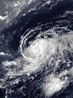 The depression moved to within 100 miles (160 kilometers) of Bermuda and slowly intensified.[19] Late that afternoon, Tropical Depression Five had intensified into a 40 mph (65 km/h) storm and was named Chantal. Chantal intensified rapidly, intensifying to hurricane status late on September 11. It then turned to the east and gained a weak upper-level cirrus-cloud outflow. The structure of the system changed little over the next 24 hours, before Chantal lost organization and was downgraded to a tropical storm on the night of the 12th.[19]