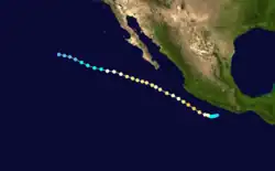 The origins of Hurricane Ismael were from a northward bulge of the Intertropical Convergence Zone (ITCZ) in early August, which resulted in the formation of a tropical depression on August 8. Six hours later, it was upgraded into Tropical storm Ismael. Continuing to intensity, Ismael was upgraded into a hurricane late on August 10 and subsequently developed an eye. The storm soon reached its peak of 100 mph (155 km/h). Late on August 11, Hurricane Ismael began to weaken as it encountered cooler waters and the hurricane was soon downgraded to a Category 1 on the SSHWS. The following day, Ismael was downgraded into a tropical storm about 380 mi (610 km) west of the Baja California peninsula. On August 14, the storm was downgraded into a tropical depression while centered about 250 mi (400 km) west of Point Ensenada.[7] Ismael dissipated that day.[3]