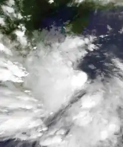 A surface low formed within the monsoon trough on August 25. The low drifted westward as convection tried to consolidate around the center. Strong upper level wind shear inhibited development for the next couple of days. It took until late on August 28 for a single circulation center to consolidate, and when it did, gale-force winds around the center forced an upgrade from a monsoon depression to a tropical storm about 200 kilometres (120 mi) east of Luzon. Moving westward, it struck Luzon early on August 29. By late morning, the system turned west-northwest over the mountainous island, emerging into the South China Sea. A total of 121 lives were taken by June across the Philippines,[17] and damage totaled US$5 million (1984 dollars.)[1] A weakness in the subtropical ridge to its north led to a turn to the northwest, and the system made landfall 240 kilometres (150 mi) east of Hong Kong. Winds gusted to 38 knots (70 km/h) at Tate's Cairn, and total rainfall at Cheung Chau reached 187.3 millimetres (7.37 in).[1] When Tropical Storm June hit southeast China on August 30, 67 people were reported dead due to extensive flooding from June's broad circulation.[18]