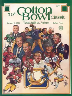 The 1986 Cotton Bowl Classic was the 50th edition of the college football bowl game, played at the Cotton Bowl in Dallas, Texas, on Wednesday, January 1. Part of the 1985–86 bowl game season, it matched the sixteenth-ranked Auburn Tigers of the Southeastern Conference (SEC) and the Texas A&M Aggies of the Southwest Conference (SWC).[1] A slight underdog, Texas A&M won by twenty points, 36–16.[3][4][5][6]