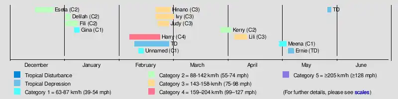 | Harry | February 8 – 23 | Category 4 severe tropical cyclone | 165 km/h (105 mph) | 940 hPa (27.76 inHg) | New Caledonia | |||