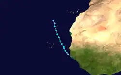 A well-organized disturbance moved off the African coast on September 6 and rapidly developed into Tropical Depression Eleven. The NHC began issuing advisories on September 8 while it was 350 mi (560 km) northeast of Cape Verde. An after-the-fact review of satellite and ship reports indicated that the depression reached tropical storm-strength on September 7.[44][45] However, because of its extreme eastern track, the storm's observational track did not include this information.