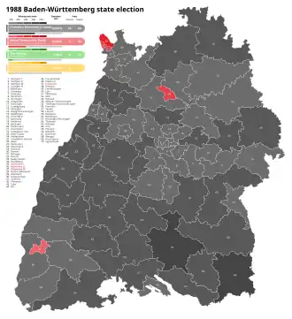 The 1988 Baden-Württemberg state election was held on 20 March 1988 to elect the members of the 9th Landtag of Baden-Württemberg. The incumbent Christian Democratic Union (CDU) government under Minister-President Lothar Späth was re-elected, retaining its majority. The overall results were not significantly different from the 1984 Baden-Württemberg state election, although all four major parties received a smaller proportion of the vote.