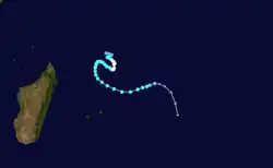 Operationally, the MFR considered the tropical cyclone year to begin on August 1 and continue to July 31 of the following year.[1] However, the JTWC began the year on July 1 and it lasted through June 30 of the following year.[2] The latter agency tracked two short-lived tropical cyclones in July 1989, labeling them Tropical Cyclone 01S and 02S, but they are not considered part of MFR's season.[2] After these early storms, another tropical depression formed east of Diego Garcia on September 21, classified as Tropical Cyclone 03S.[4] Forming from the near-equatorial trough,[5] the system moved generally to the southwest, dissipating on September 27 as it approached Mauritius.[4] In the next month, Tropical Cyclone 04S formed closer to Diego Garcia on October 11. The JTWC classified it as a tropical depression on October 13 but dropped advisories the next day. The system initially drifted to the south but later turned to the northwest, dissipating on October 17.[2][6] The final of a series of early tropical systems was a tropical depression that formed east of Diego Garcia on October 28. It moved southeastward, classified by the JTWC as Tropical Cyclone 05S on October 31. The agency briefly estimated peak winds of 65 km/h (40 mph), making it a tropical storm, before the storm looped back to the west and dissipated on November 2.[2][7] Later, the precursor to Australian Tropical Cyclone Bessi was tracked in the eastern portion of the south-west Indian Ocean basin in the middle of April. The Australian Bureau of Meteorology (BOM) classified the system as a minimal tropical storm while still west of 90° E, although the MFR did not classify the system before it entered the Australian basin on April 15.[8]