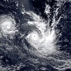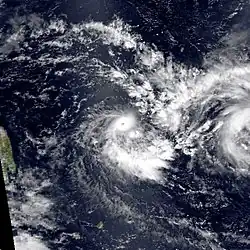 On January 31, a tropical disturbance formed just east of Agaléga. Moving southeastward, it intensified into Moderate Tropical Storm Cezera on February 1,[17] the same day that the JTWC began tracking it as Tropical Cyclone 14S.[2] Cezera quickly intensified, and the JTWC upgraded it to the equivalence of a minimal hurricane on February 3 with 1‑minute peak winds of 150 km/h (93 mph). By contrast, the MFR only estimated peak 10‑minute winds of 95 km/h (59 mph).[17] By February 4, Cezera began a Fujiwhara interaction with Tropical Cyclone Dety, which was located to the east; this caused the former storm to turn back to the northwest while gradually weakening.[17][18] On February 6, the storm turned to the south and later southeast, weakening to tropical depression status that day. Cezera briefly re-intensified into a moderate tropical storm on February 7, but weakened again on the next day while passing just north of St. Brandon. After turning more to the east-northeast, the system turned sharply southward on February 10, and dissipated the next day.[17]