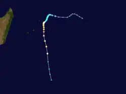 The MFR began tracking a tropical disturbance on March 1 between Mauritius and Diego Garcia,[20] which was followed by the JTWC for several days previously and classified as Tropical Cyclone 18S.[2] Within a day, it intensified into Moderate Tropical Storm Edisoana while tracking southwestward. On March 4, the JTWC upgraded the storm to the equivalent of a minimal hurricane, and on the next day the MFR followed suit by upgrading Edisoana to tropical cyclone status. The latter agency estimated peak 10‑minute winds of 135 km/h (84 mph), while the JTWC assessed a peak 1‑minute intensity of 185 km/h (115 mph). Around that time, the storm passed west of Rodrigues island. Edisoana accelerated southward and gradually weakened,[20] influenced by an approaching trough. On March 7, the storm began transitioning into an extratropical cyclone,[21] completing it by the next day.[20] The extratropical cyclone rapidly intensified due to the influence of the trough and a nearby ridge,[21] later being absorbed by the westerlies.[22]