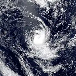 A tropical disturbance formed on January 2 to the northwest of the Cocos Islands,[14] which was tracked by the JTWC for the preceding few days before being classified as Tropical Cyclone 09S.[2] It originated from the monsoon trough, which is an extended low pressure area within a convergence zone.[15] It gradually intensified as it moved slowly to the southwest due to a high pressure system, or ridge, to the east.[15] On January 3, the system intensified into Moderate Tropical Storm Baomavo, and two days later attained tropical cyclone status while turning more to the south. The JTWC estimated peak 1‑minute winds of 155 km/h (96 mph) on January 5, and on the next day the MFR estimated peak 10‑minute winds of 150 km/h (93 mph).[14] An approaching cold front caused Baomavo to weaken while the storm turned southeastward.[15] By January 8, the system weakened to tropical depression status while looping back to the northwest,[14] steered by a ridge to the southwest.[16] On the next day, Baomavo dissipated over the open waters of the Indian Ocean.[14]