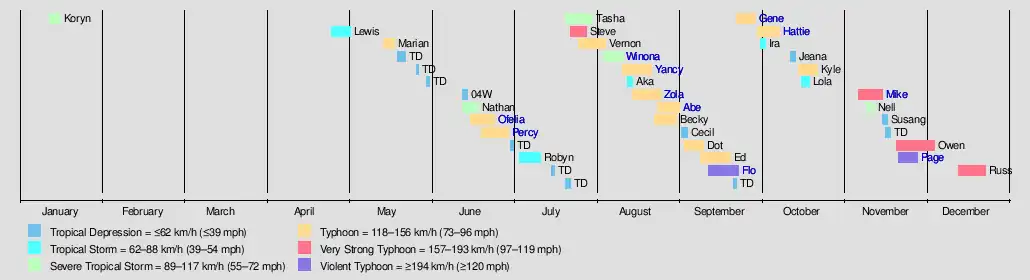 The 1990 Pacific typhoon season was another active season, with 31 storms being named during the year. It had no official bounds; it ran year-round in 1990, but most tropical cyclones formed in the northwestern Pacific Ocean between May and November.[1] These dates conventionally delimit the period of each year when most tropical cyclones form in the northwestern Pacific Ocean.