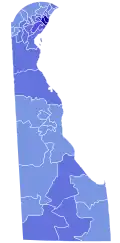 Biden won all three counties for the third election in a row.[32][33] Biden's best performance was in New Castle County, where he won 62 percent of the vote to Brady's 36 percent. Brady's best performance was in Kent County, where she won around 40 percent of the vote to Biden's 58 percent, his lowest share of the vote. Kent County was also Rosenbaum's best performance, where he won slightly under two percent. New Castle County had the highest number of votes cast, with 103 thousand, followed by Sussex County with 86 thousand.[7]