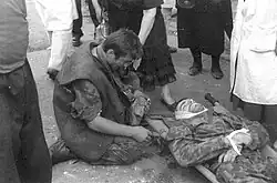 The Military Council, which represents the opposition, declared during the conflict that the majority of pro-Gamsakhurdia soldiers were 18 or 19 years old and were coerced into fighting.[43] According to the Council, there was only a very small group of armed fighters belonging to the government's OMON, a special, highly trained branch of the National Guard.[43] Some of those who fought on Gamsakhurdia's side were reportedly devoted female followers of his dressed in black, known as "furies" or the "Black Pantyhose Battalion".[47][48] A youth militia from the mountainous region of Svaneti, nicknamed "Lemi" (ლემი, or "Lion" in Svan) also fought for the president.[48]