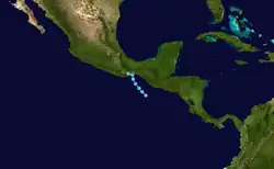 A tropical disturbance south of the Gulf of Tehuantepec became better organized on June 29 and became a tropical depression.[10] Strengthening was very limited as the depression was approaching land.[11] It made landfall later that day very near Salina Cruz, Oaxaca.[12] As it continued its west-northwest track, it dissipated inland after bringing torrential rains.[13]