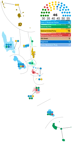 Seven parties contested the election. The Union of Moderate Parties obtained 19 seats, the same number as during the previous election, but this time these were sufficient to place it in the lead. The Vanua'aku Pati and the National United Party obtained ten seats each, marking the VP's first electoral defeat.