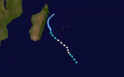 A few days after Colina formed, the ITCZ spawned another area of convection on January 16 in the northeast portion of the basin. The next day, a low-pressure area formed between the Chagos Archipelago and Diego Garcia, and on January 19 the system developed into a tropical disturbance after convection increased. Following further organization, the system intensified into Tropical Storm Edwina on January 20 while moving generally westward. Increasing wind shear prevented significant strengthening initially, but Edwina was able to intensify more on January 21.[4] On January 23, the JTWC upgraded the storm to the equivalent of a minimal hurricane on the same day that MFR upgraded Edwina to tropical cyclone status. On the next day, the JTWC estimated the cyclone attained peak winds of 205 km/h (125 mph),[13] after Edwina developed a well-defined 75 km (47 mi) wide eye.[4] On January 26, the MFR estimated that the cyclone reached peak 10-minute winds of 170 km/h (105 mph),[13] making Edwina the strongest storm of the season. Around that time, the cyclone turned more to the south around a large ridge,[4] maintaining peak winds through January 27. By that time, the eye became large and ragged while passing halfway between Rodrigues and St. Brandon. On January 27, Edwina passed about 220 km (140 mi) east of Mauritius. On the next day, increased wind shear caused marked weakening, quickly destroying the eye and lowering the winds below tropical cyclone force. On January 29, Edwina ceased existing as a tropical system, although its remnants persisted several more days, affecting Île Amsterdam in the south-central Indian Ocean on February 2.[4]