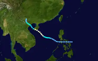 In Vietnam, at least 21 people died and while 80 were reported missing.[15] Intense winds uprooted over 500 trees, downed electrical cables and damaged about 140 houses in Hanoi. As a result of the storm, in the capital alone, three people were killed while another three were injured. Massive waves engulfed several coastal fishing villages in Cát Hải district, with seven people being missing there.[17] Elsewhere, in Hainan, one person died.[16] In the Philippines, combined with the effects of nearby Bobbie, heavy rainfall would produce mudflows in the Philippines. These poured down the Bucao, Balinquero and Maraunot rivers, causing them to rise up 6 ft (1.8 m).[12] Economic losses in Hainan are estimated at 223 million RMB (US$40.5 million).[18]