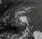 Tropical Depression Ten developed about 185 mi (298 km) southeast of Bermuda at 18:00 UTC on September 29.[10] Initially, convection associated with the depression was confined to north and east of the center.[64] The depression was difficult to track, though wind observations in Bermuda suggested that it passed just north of the island between 0300 and 07:00 UTC on September 30. Although no intensification was predicted, the National Hurricane Center noted that interaction with the approaching cold front could result in baroclinic strengthening.[65] The depression did not organize further and merged with the cold front at 00:00 UTC on October 1.[10]