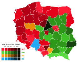 During the campaign, the victorious left wing segmented the electoral market, on the one hand emphasizing the threat of perceived Catholic fundamentalist policies such as concordat and strict abortion policy addressing its message to the left-wing electorate, and on the other, playing on the sentiment for the times of the Polish People's Republic for economic stability, it sought rapprochement with those who were not beneficiaries of the changes that followed the collapse of the communist system and expected an alternative in the socio-economic dimension, applying primarily to employees of the public sector and those employed in state-owned industry, including the liquidated State Agricultural Farms.[8] The SLD blamed the doctrinaire and incompetence of the Solidarity teams for the mistakes of the transformation, declaring that it had a program and human resources capable of correcting the direction taken at the beginning of the Third Polish Republic. The PSL called for greater interventionism and protectionism in the economy. It also criticized the ongoing privatization, pointing to the advantages of other forms of ownership, such as cooperatives. Alongside with the SLD, it criticized parties and politicians of Solidarity origin. With its bold social appeal it tried to exploit the skepticism of residents of rural areas and small towns, where there were many dissatisfied with the systemic transformation.[9]