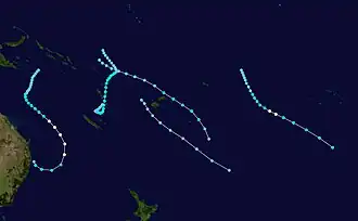 | Vania | November 12 – 18 | Category 2 tropical cyclone | 100 km/h (65 mph) | 980 hPa (28.94 inHg) | Solomon Islands, Vanuatu, New Caledonia, Fiji | Unknown | Unknown | [4] |
