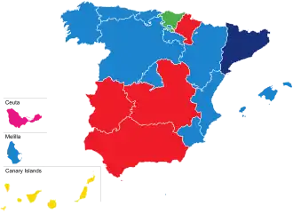 The following table lists party control in autonomous communities and cities. Gains for a party are highlighted in that party's colour.