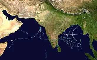 The IMD tracked nine tropical disturbances, including one that developed over land, which is below average of 13 systems. Five of the storms formed from October to December, after the end of the monsoon season. In general, storms moved slower than average, and two of the cyclones took unusual tracks near land – one executed a rare loop in the Bay of Bengal, and another turned abruptly away from the Indian state of Gujarat.[1] According to the JTWC, activity in the basin was 60% greater than average, with eight tropical cyclones. Four of these storms attained hurricane intensity – winds of at least 120 km/h (75 mph) – which was a record at the time.[3]