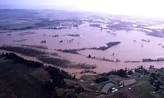The Willamette River crested at 28.6 feet (8.7 m) in Portland on February 9, reaching major flood stage and causing some flooding issues in lowlying parts of the city, including the Northwest Industrial Area. Sandbags were placed along the downtown seawall to prevent flooding, but the river came a few inches short of overtopping the lowest sections.[10][11] Further upstream, cities from Oregon City to Corvallis were impacted by rising waters on the Willamette River and Oregon Department of Agriculture was forced to temporarily relocate to a new facility in the Salem area.[7][12] The water reached so high in Oregon City that Willamette Falls almost disappeared.[13] Several rivers flowing west out of the Oregon Coast Range into the Pacific also flooded. The dairy industry in Tillamook County with 500 cattle having drowned and sediment left behind covering about a quarter of the grazing land in the county.[14]
