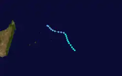 On February 16, Cyclone Victor crossed into the basin from the Australian Region with a well-defined circulation but little convection. Despite being downgraded to a tropical disturbance, the system was named Cindy by the Mauritius Meteorological Service on February 16. The system continued gradually weakening while turning more to the southwest, dissipating on February 19.[1] This marked the end of a 50‑day period in which the related storms Katrina and Victor-Cindy were active.[15]