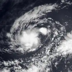 In early July, shower activity increased in association with an area of disturbed weather. With surface pressures lower than normal for a tropical disturbance, deep convection increased further and Tropical Depression Six-E formed late on July 5 and reaching tropical storm status the following day and was named Dolores. Despite moderate wind shear, very cold cloud tops formed as the winds increased to 60 mph (95 km/h), a moderate tropical storm. Moving westward, Dolores strengthened into the first hurricane of the season on July 7 as a ragged eye formed.[17]
