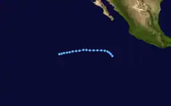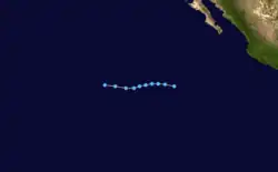 A broad region of active weather persisted west of Mexico during the middle of August 1997, which began organizing on August 16 as it developed rainbands. The thunderstorms organized around a circulation, evolving into a tropical depression early on August 17 while located approximately 520 mi (840 km) southwest of Cabo San Lucas. It formed outside of the area in which tropical cyclones usually form in the Eastern Pacific Ocean basin, and moved northwestward at 11 to 17 mph (18 to 27 km/h) under the steering currents of mid- to upper-level trough off the coast of California. After the depression developed a burst of deep convection over its center, the NHC upgraded it to Tropical Storm Ignacio at 12:00 UTC on August 17, with peak sustained winds of 40 mph (64 km/h) and a minimum pressure of 1,005 mbar (29.7 inHg). However, due to increasingly colder waters and the presence of inhibiting southwesterly wind shear, Ignacio weakened back into a tropical depression on August 18. A day later, the depression transitioned into an extratropical cyclone, which continued northward until dissipating a day later near the coast of California. Moisture from the system persisted as it passed through the state and the Pacific Northwest, ultimately merging with a larger extratropical cyclone involving the remnants of Hurricane Guillermo.[22]