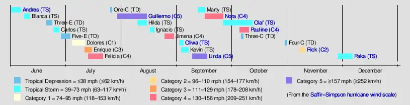 Typhoon PakaHurricane Rick (1997)Hurricane PaulineTropical Storm Olaf (1997)Hurricane Nora (1997)Hurricane Linda (1997)Typhoon OliwaHurricane Guillermo (1997)Tropical Storm Andres (1997)Saffir–Simpson hurricane wind scale