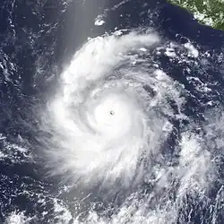 Located in an area conducive to further development, Darby attained hurricane status on July 24, subsequent to the development of a 17-mile (27 km)-wide eye.[17] The eye became more distinct while surrounded by an area of deep convection, and on July 25 the hurricane reached peak winds of 115 mph (185 km/h) about 850 miles (1,370 km) southwest of Cabo San Lucas.[18] The eye soon disappeared on satellite imagery, believed to be from an eyewall replacement cycle, and Darby's winds weakened to about 105 mph (169 km/h). A 25-mile (40 km) eye next developed, and on July 26, the hurricane re-intensified to reach peak winds of 115 mph (185 km/h).[17] For a 30-hour period, Darby attained the characteristics of an annular hurricane, retaining a well-defined structure with few banding features for an extended period.[19] The hurricane began to weaken while entering an area of cooler water and increased wind shear, and after crossing into the jurisdiction of the Central Pacific Hurricane Center, Darby weakened to a tropical storm on July 29. The storm degenerated into a tropical depression on July 31, and early on August 1, Darby dissipated a moderate distance north of the Hawaiian Islands. It never affected land.[17]