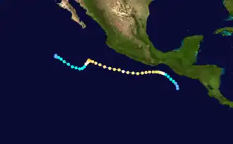 A tropical wave was first observed in the eastern Pacific Ocean on August 4 in association with the Intertropical Convergence Zone. It tracked westward, and by August 9 a low-level circulation formed well to the south of Mexico. Banding features increased as the system detached from the Intertropical Convergence Zone, and on August 11, the system developed into Tropical Depression Eight-E about 730 miles (1,170 km) southwest of Acapulco.[30] On becoming a tropical cyclone, the depression maintained an area of concentrated deep convection near the center. The National Hurricane Center initially predicted that the depression would slowly intensify and reach winds of 70 mph (110 km/h) within 72 hours. For much of the rest of the storm's duration, the National Hurricane Center underestimated the intensity of the cyclone.[31]