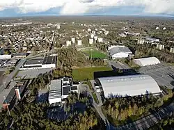 The drone shot (taken in May 2020) of the 1999 Worlds venue, visibly shown on front right.