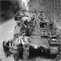 During the night reinforcements came up from 25th Division, and CCLVI Bde was allocated two batteries of CXII Bde to make up its losses.[55][56] The Germans maintained the pressure on the following day. Attempting to widen the hole in the flank, large numbers of Germans were seen at 2,000 yards (1,800 m) range: all four of CCLVI Bde's batteries hauled their guns out of their pits, swung them round, and engaged the enemy over open sights, inflicting such heavy casualties that further progress was checked for a time. B Battery then fired smoke to cover the advance of a battalion of British tanks coming up. When the Germans ran from this counter-attack, the four batteries again did great execution, and were able to catch the German artillery coming up to support their infantry, B Bty's 18-pdrs and D Bty's howitzers combining to destroy two guns and their teams and prevent the enemy battery from coming into action. The brigade fired continuously for four hours over open sights, the howitzers using instantaneous fuzes. Luckily the brigade was close to the divisional ammunition dump, and there was no shortage: the 18 surviving guns of the brigade fired 18,100 rounds of 18-pdr ammunition, and 2500 of howitzer; B Bty alone fired 1750 rounds per gun (rpg). By the time the German guns were able to fire it was dusk, and CCLVI Bde slipped away to the new line being taken up by 51st (H) Division. That night 51st (H) Divisional Artillery received 17 new guns to replace those it had lost. All the field artillery covering the divisional front was placed under the command of Lt-Col L.M. Dyson, CO of CCLVI Bde.[57][58][59]