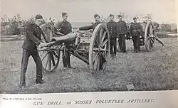 In 1899 the Artillery volunteers were transferred to the Royal Garrison Artillery (RGA), the Sussex units becoming the 1st Sussex RGA (V) at Brighton and 2nd Sussex RGA (V) at Eastbourne respectively, with the 2nd Sussex designated as position or 'heavy' artillery.[3][4][5][6]