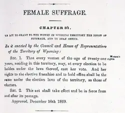 - ^ "Passage of the Female Suffrage Bill". The Philadelphia Inquirer. December 7, 1869. p. 4. Archived from the original on May 25, 2020. Retrieved May 25, 2020 – via Newspapers.com.