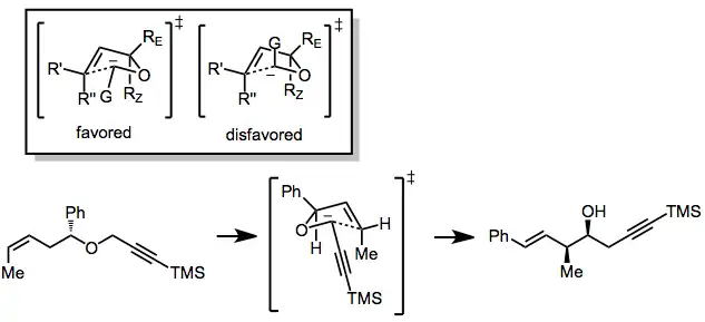 The postulated transition state possesses a five-membered, envelope-like structure.[5] The group attached to the carbanion (G) can occupy either a pseudoequatorial or pseudoaxial position, although the former is usually preferred. Large substituents on the other side of the ether oxygen prefer to occupy the exo position (RE) to avoid A1,3 strain. These restrictions lead to a preference for the syn product from (Z) isomers and anti products from (E) isomers; however, some exceptions to this rule are known.[6]