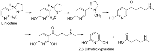 - ^ Gherna, R; et al. (1965). "The Bacterial Oxidation of Nicotine VI. The Metabolism of 2,6-dihydroxypseudooxynicotine". J. Biol. Chem. 240 (9): 3669–3674. doi:10.1016/S0021-9258(18)97197-8. PMID 5835946.