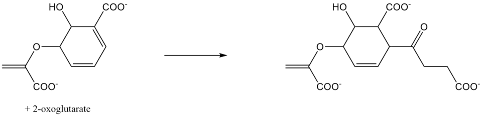 In the biosynthesis of vitamin K, SEPHCHC is involved in the second step of the pathway.[1] The type of reaction is decarboxylating, and to have maximum activity, this enzymes uses the cofactor Mg2+, a magnesium ion.[2] In previous years, it was thought that this reaction led to SHCHC, the product MenH. After further research, we now know that this reaction is a new step in the pathway. The actual product of this enzyme can lose a pyruvate spontaneously.[3]