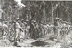 Allocated to the 23rd Brigade of the 8th Division,[2] after initial training it was sent north to Darwin in September to construct defences around the Adelaide River and Noonamah amidst concerns about Japanese intentions in the Pacific.[3] While most of the division deployed to Malaya, the 2/4th remained behind and following the Japanese entry into the war, the battalion was allocated to bolster the garrison at Koepang as part of Sparrow Force on Timor. An advanced party was sent to the island in early February 1942,[4] and on 14 February the rest of the battalion followed; however, the convoy in which they were embarked was attacked by Japanese aircraft and it was turned back. Returning to Darwin, the majority of the 2/4th's equipment was lost when the ship carrying it was sunk in Darwin harbour during a Japanese air attack on 19 February.[5] Consequently, the battalion's deployment was cancelled and it remained in the north for more than a year, during which time they undertook defensive duties to counter the threat of Japanese invasion.[3] During this time, the battalion was commanded by Lieutenant Colonel John McCarty.[6] In November 1942, the battalion was reassigned to the 3rd Brigade, a Militia formation that had been mobilised for full-time service and sent to the Northern Territory earlier in the year to bolster the field force there.[2][7]