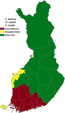 There were three other female presidential candidates in 2000: Riitta Uosukainen of the National Coalition, Elisabeth Rehn of the Swedish People's Party, and Heidi Hautala of the Greens. Halonen's popularity rose significantly during the last few months before the first round of the 2000 presidential elections, while Uosukainen's and Rehn's popularity declined. Former Prime Minister Esko Aho, the Centrist presidential candidate, emerged as the second most popular candidate. Halonen received votes from women across party lines, and she was partly helped by her lack of a major left-wing opponent, and by her reputation as a tolerant, human rights-oriented person. The election was decided by slightly over 100,000 votes, and the voter turnout was much higher than in the 1996 municipal elections or in the 1999 parliamentary elections.[2][3][4]