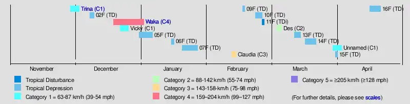 | Waka | December 19 – January 2 | Category 4 severe tropical cyclone | 185 km/h (115 mph) | 930 hPa (27.46 inHg) | Wallis and Futuna, Niue, Tonga, New Zealand | $51.3 million | 1 | |