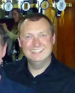 In this round Walton whitewashed the four-time semi-finalist Andy Fordham 3–0.[19] Walton led 1–0 before Fordham took a solitary leg in the second set.[20] He then claimed the third set to eliminate Fordham in the first round for the first time in his eighth appearance in the tournament.[19] The 1998 tournament semi-finalist Colin Monk overcame Tony O'Shea 3–2.[10][19] Monk was two legs behind when he won three in a row to claim the first set. O'Shea won three consecutive legs for the second set and level the score before Monk won the third to go 2–1 ahead. O'Shea forced a final set decider that Monk won after O'Shea missed five attempts on a double ring. Gary Anderson won with scorelines of 3–1 in the first two sets against Nagy and whitewashed him 3–0 in the third set.[20] Van Barneveld defeated George 3–1 to stop the latter from becoming the tournament's oldest winner aged 57. He began with a maximum en route to claiming the first and second sets. George had a failed attempt at a nine-dart finish in the third set. He recovered to claim the set after five legs.[21] George led the fourth set before Van Barneveld won the match.[20]