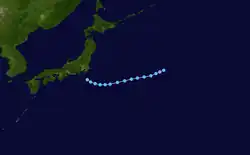 While accelerating northeastward, Hagibis developed a well-defined eye and underwent a period of rapid deepening.[26] On May 19, the JMA estimated peak 10-minute winds of 175 km/h (109 mph),[10] and the JTWC estimated 1-minute winds of 260 km/h (160 mph);[11] this made Hagibis become a second super typhoon after Mitag. At the time of its peak, the typhoon was located about 305 km (190 mi) west-southwest of the Northern Mariana Islands.[26] Hagibis only maintained its peak for about 12 hours,[10] after which the eye began weakening.[26] The trough that caused the typhoon's acceleration also caused the storm to lose tropical characteristics, and dry air gradually became entrained in the circulation.[26] On May 21, Hagibis became extratropical to the east of Japan after having weakened below typhoon intensity. The remnants continued to the northeast and dissipated south of the Aleutian Islands on May 22.[10]
