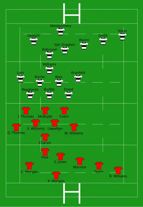 Wales opened the scoring in the 12th minute thanks to a penalty from Jones, before a chip-and-chase from Peel led to the first try of the game for Mark Taylor five minutes later. Jones missed the conversion, but added another penalty to extend the lead to 11–0 as the game moved into the second quarter. In the last 10 minutes of the half, Wales added another two tries; first, Craig Morgan finished an attacking move out wide, before Gavin Thomas managed to finish under the posts following good work by fellow back-rowers Martyn Williams and Colin Charvis. Jones converted both tries to give Wales a 25–0 lead at half-time. At the interval, brought Jenkins and Parks on in place of Iestyn Thomas and Martyn Williams, and within a minute of the restart he was forced into another change as Jamie Robinson came on for the injured Andy Marinos. Soon after, the Barbarians scored their first try thanks to Ollie Smith, with the conversion added by Braam van Straaten. Five minutes later, Thinus Delport ran in another score and Van Straaten again added the extras. As the game entered its final 20 minutes, the Barbarians took the lead with two quickfire tries; Delport scored his second in the 62nd minute, before Newport's South African prop Adrian Garvey crossed in the 65th, and Van Straaten converted both to give the Barbarians a 28–25 lead. Van Straaten kept up his 100% kicking record after Garvey scored a second try as the game drew to a close, only to miss the conversion as captain Pat Lam completed the scoring in injury time.[24][25]