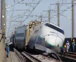 For the first time in its 40-year history, a Shinkansen train derailed while in service, the train being too close to the epicentre to be halted by the automatic UrEDAS earthquake detection system.[13] Eight out of ten cars of the Toki 325 service (a 200 Series Shinkansen train) derailed on the Joetsu Shinkansen line between Nagaoka Station in Nagaoka and Urasa Station in Yamato; no injuries were reported among the 155 passengers. The railbed, bridges and tunnels were all affected. East Japan Railway Company (JR East) stopped all trains in Niigata Prefecture, including the extensively damaged Joetsu Line, Shinetsu Main Line, Iiyama Line, Tadami Line and Echigo Line. Part of Nagaoka Station appeared ready to collapse as a result of an aftershock, but after a brief closure, the station reopened.