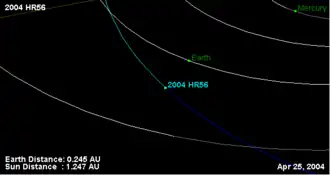 2004 HR56, is a micro-asteroid, classified as near-Earth object belonging to the Apollo group. It was first observed by Spacewatch at Kitt Peak National Observatory on 25 April 2004.[3]
