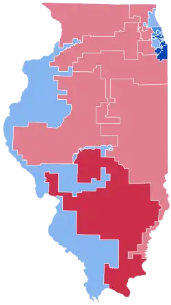 Illinois assigned 60 directly elected delegates (the state had another 13 delegates that were not directly elected by voters).[5] The Illinois primary was a so-called "Loophole" primary. This meant that the statewide presidential preference vote was a "beauty contest", from which no delegates would be assigned. Instead, the delegates were assigned by separate direct-votes on delegate candidates (whose proclaimed presidential preferences were listed beside their names on the ballot).[5] These delegates were noted voted on at-large by a state vote, but rather by congressional district votes.[5] The number of delegates each congressional district would be able to elect had been decided based upon the strength of that district's vote for the Republican nominee (Bush) in the previous 2000 election.[5] This meant that four delegates each were elected from Illinois's 6th, 8th, 10th, 11th, 13th, 14th, 15th, 16th, 18th, and 19th congressional districts, three delegates each were elected from Illinois's 12th and 17th congressional districts, and two delegates each were elected from Illinois's 1st, 2nd, 3rd, 4th, 5th, 7th, and 9th congressional districts [5]